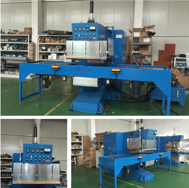 通過(guò)人工放料,高周波自動(dòng)熱合壓邊切熔,定型,工作時(shí)通過(guò)人工放料,放入模具位置上,按起動(dòng)開(kāi)關(guān),底部模具滑板自動(dòng)滑動(dòng)到固定工作位置,機(jī)頭氣缸驅(qū)動(dòng)工模下降,通過(guò)延時(shí)預(yù)熱、高周熔接、切斷、定型,定型完畢機(jī)頭上升,底部工模滑板自動(dòng)滑出,人工取出成品。在生產(chǎn)中可自由設(shè)置各部時(shí)間,一般為3--6秒一個(gè)作業(yè)過(guò)程。